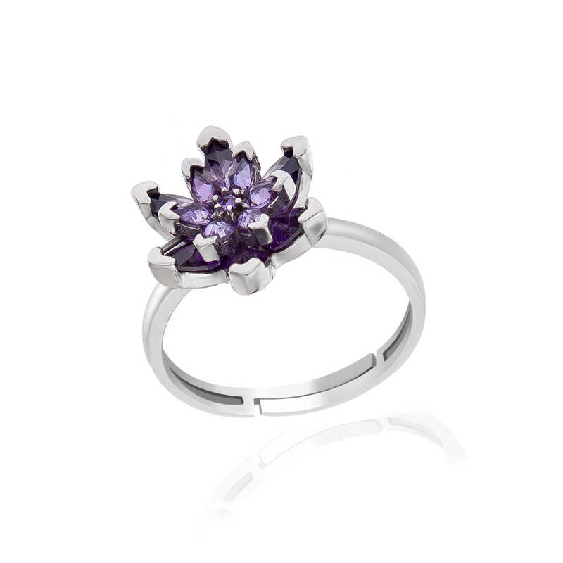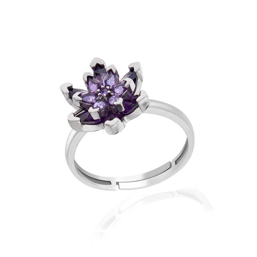 Silver Adjustable Purple Stone Lotus Flower Women's Ring The lotus flower is one of the most beautiful flowers that symbolizes spirituality, morality, and cleansing. Blooming in the polluted waters of the rainforest, the lotus flower has become a symbol of beliefs such as Buddhism and Hinduism with its beauty and purity. Moreover, the lotus flower is considered sacred in many ancient civilizations. Another detail that makes the lotus flower special is the region in which the flower grows. The lotus flower, which grows especially in swamps and muddy lands, can remain clean despite the polluted environment in which it grows. Able to clean even a single particle of dust that lands on it, the lotus flower greets those who encounter it with its pure white beauty. You can gift your loved ones or treat yourself with this silver purple lotus flower ring, which is considered sacred in different cultures. This stylish ring is a perfect option for a birthday gift, Valentine's Day, or special occasions. The ring is made of 925 sterling silver. Rhodium plated silver. Like other rings, the silver purple lotus flower ring is also handmade. Due to silver and precious stones, there may be a ± 10% deviation from the average product weight. Width: 1.80 cm Length: 2.30 cm Average Weight: 3.30 gr.