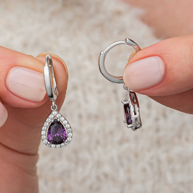 Silver Purple Zircon Stone Drop Women's Earrings Purple is also considered a color of love and passion. Zircon represents elegance and beauty, so these earrings can be worn as a symbol of a special bond or relationship. Silver purple zircon stone drop women's earrings are a perfect option for birthday gifts, Valentine's Day gifts or special occasions as a gift for mothers. Silver hoop women's earrings are made of 925 sterling silver. Rhodium plated silver. Rhodium plated silver drop women's earrings preserve their shine for a long time and oxidation is delayed. Like all women's earrings, silver drop women's earrings are produced by hand. Due to silver and precious stones, there may be a ± 10% deviation in the average product weight. Width: 1.00 cm Earring Diameter: 2.60 cm Average Weight: 4.00 gr.