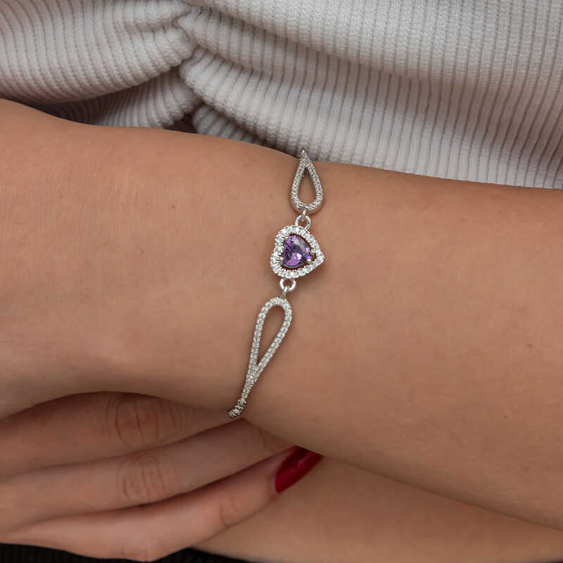 Silver Purple Zircon Stone Heart Bracelet Zircon stone heart bracelet is a special piece of jewelry that brings together elegance and grace. Zircon stones make the bracelet more eye-catching with their shiny and sparkling structure, while the heart shape symbolizes love and commitment. Rhodium plated on silver. Rhodium plated heart bracelet preserves its shine for a long time and oxidation is delayed. As with all women's bracelets, the silver purple heart women's bracelet is also handmade. Due to silver and precious stones, there may be ± 10% deviation in the average product weight. Heart Diameter: 1 cm Bracelet Length: 21 cm Avg. Weight: 4.50 gr.