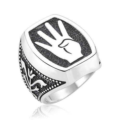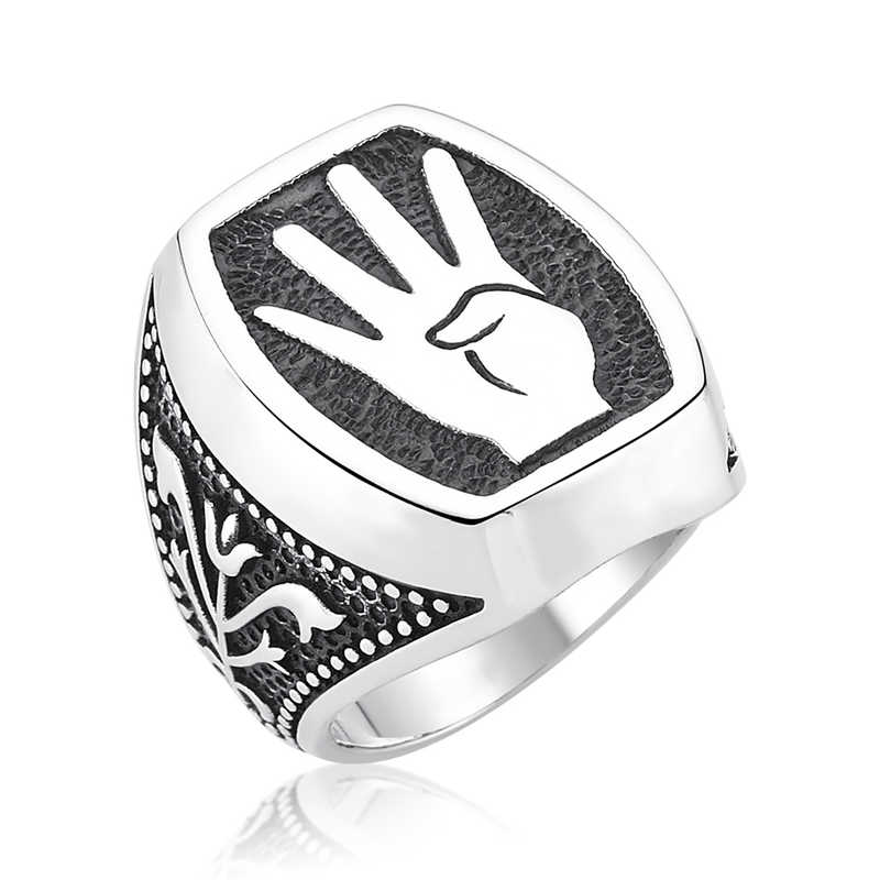 Silver Rabia Sign Men's RingRabia means 4th in Arabic. Morsi supporters adopted this sign to refer to both Rabia al-Adawiyya Square where they gathered and Morsi's being the 4th president. Rabia al-Adawiyya Square takes its name from a Sufi poet who lived in the 8th century. Rabia is the 4th child of her family. Rabia spent her childhood as a slave and was freed after attempting to escape. Because of this, she became a symbol of freedom in Egypt. You can love this meaningful ring and gift it to your loved ones. Silver Rabia Sign men's ring is made of 925 sterling silver. Rhodium plated silver. Rhodium plated products preserve their shine for a long time and oxidation is delayed. All of our products are hand-made. Due to silver and precious stones, there may be a ± 10% deviation in product weight.Width: 2.00 cmLength: 2.30 cmWeight: 19.00 gr.