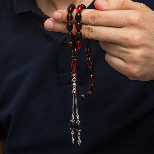 Silver Red Black Fire Amber Prayer Beads Red amber represents vitality, strength and passion. It is also known for its properties that bring energy and courage. Spiritually, it enables a courageous approach to life and to remove negative energies. Black amber is known for its protective properties. It is used to remove negative energies and evil spirits. It also provides balance and peace. The squeezed amber prayer beads model is entirely handmade like other amber prayer beads models. Note: Different models of prayer beads' silver tassel ends are sent. Grain Width: 0.80 cm Grain Length: 1.00 cm Prayer Length: 30 cm Average Weight: 25.00 gr