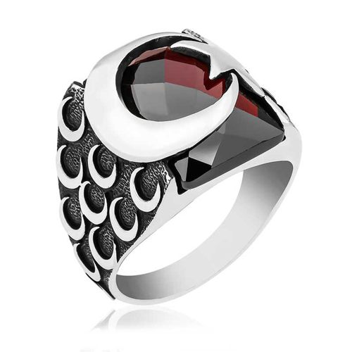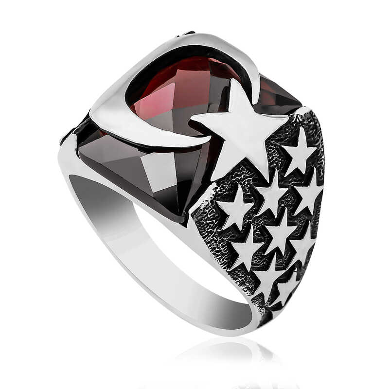 Silver Crescent Star Men's Ring with Red Cut StoneCrescent and star or crescent-star; ancient symbol consisting of a crescent and a star shape at the open end of the crescent. Flags featuring this symbol are mostly found around the Mediterranean, in the Middle East, and in Central Asia. Today, it is known as a symbol mostly used in the flags of Islamic countries. The Crescent and Star symbol appears on many flags, including the Turkish flag. Although the Moon or Crescent is identified with Islam, it was also used in pre-Islamic times; the Crescent, Star, and Sun motifs have existed throughout history in the pantheon of America, Europe, Anatolia, the Middle East, and Central Asia. Beginning in rock paintings dating back to 5000 BC in Central Asia and similarly depicted on later shaman drums, the Crescent, Star, and Sun motifs offer insights into the universe design of the Asian Turkic-Mongol peoples. However, the first documents depicting the Crescent and Star together appeared in the Sumerian cities of Mesopotamia, in what is now Southern Iraq. The first use of the Crescent and Star motif, which clearly consists of a crescent, was made by the Sumerians. The Sumerians established the first state in history in Southern Iraq in 3000 BC, representing a major step in the construction of today's civilization. They threw them. The Sumerian language was very close to Turkish. Their beliefs were largely similar to the Turks. The symbols of the Sumerian Moon God "Nana-Suen" and the Sun God "Utu" or the Goddess Inana were shown together, creating the first Crescent-Star duality. This motif is sometimes carved in stone reliefs, sometimes in seals, and sometimes on clay tablets and has survived to this day. Inspired by history, this red cut stone crescent star men's ring can be a gift to yourself or your loved ones on birthdays, Father's Day, or special occasions. This stylish men's ring is made of 925 sterling silver. Oxide coating is applied to the silver. Oxide coating gives rings an authentic look. Like all men's rings, the silver crescent star men's ring is handmade. Due to silver and precious stones, there may be a ± 10% deviation from the average product weight.Width: 1.50 cmLength: 2.00 cmWeight: 15.40 gr.