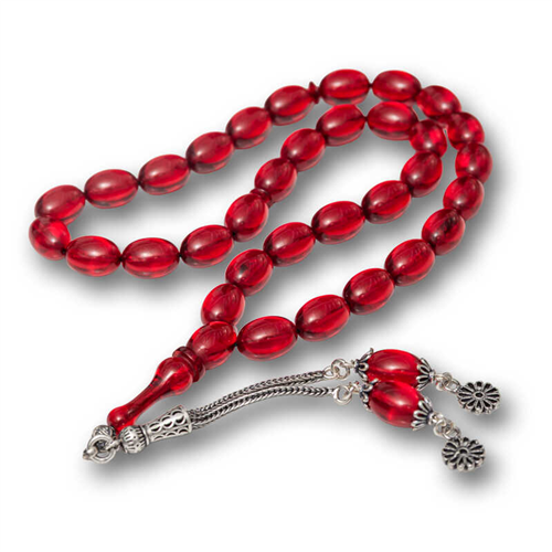 Silver Red Fire Amber Prayer Beads This prayer beads, which draws attention with its particularly eye-catching and energetic design, is enriched with natural red fire amber beads, providing a traditional and elegant appearance. With its shiny silver details and carefully arranged amber beads, this prayer beads, which carry both aesthetic and spiritual value, is a perfect choice for daily use and special moments. An indispensable gift for special occasions, fire amber prayer beads can be preferred as gifts for men on special occasions such as birthdays, Valentine's Day and Father's Day. The silver tassel fire amber prayer beads model is made entirely by hand, like other amber prayer beads models. Note: Different models of prayer beads' silver tassel ends are sent. Bead Width: 0.80 cm Bead Length: 1.00 cm Prayer Length: 30 cm Average Weight: 25.00 gr