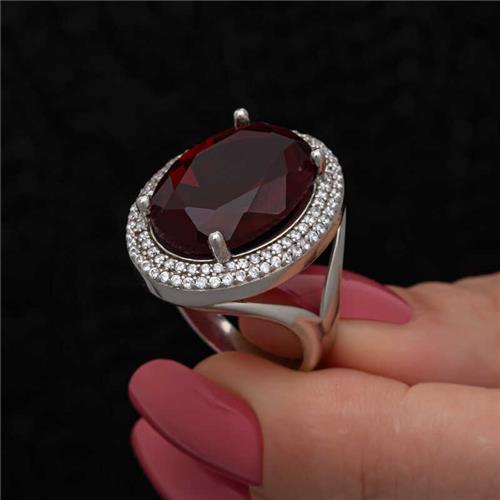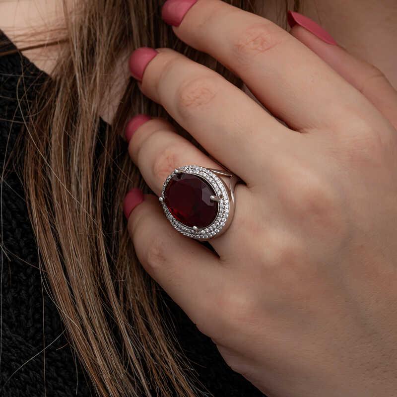 Gümüş Kırmızı Oval Taşlı Kadın Yüzük