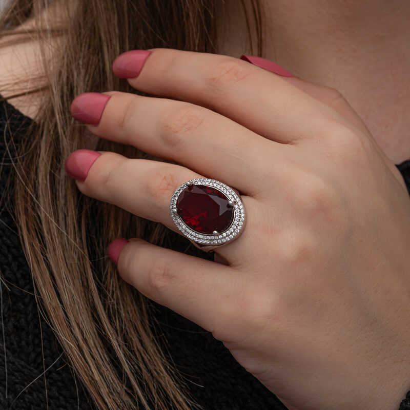 Silver Red Oval Stone Women's Ring How about surprising your loved one with a silver red oval stone women's ring that symbolizes love? Take your elegance one step further with a silver ring adorned with zircon stones. Made of 925 sterling silver. Rhodium plated on silver. Rhodium-plated products preserve their shine for a long time and oxidation is delayed. The stones on them are zircon. All of our products are handmade. Due to silver and precious stones, there may be ± 5% deviation in product weight. Ring Width: 2.20 cm Ring Length: 2.70 cm Average Weight: 6.50 gr