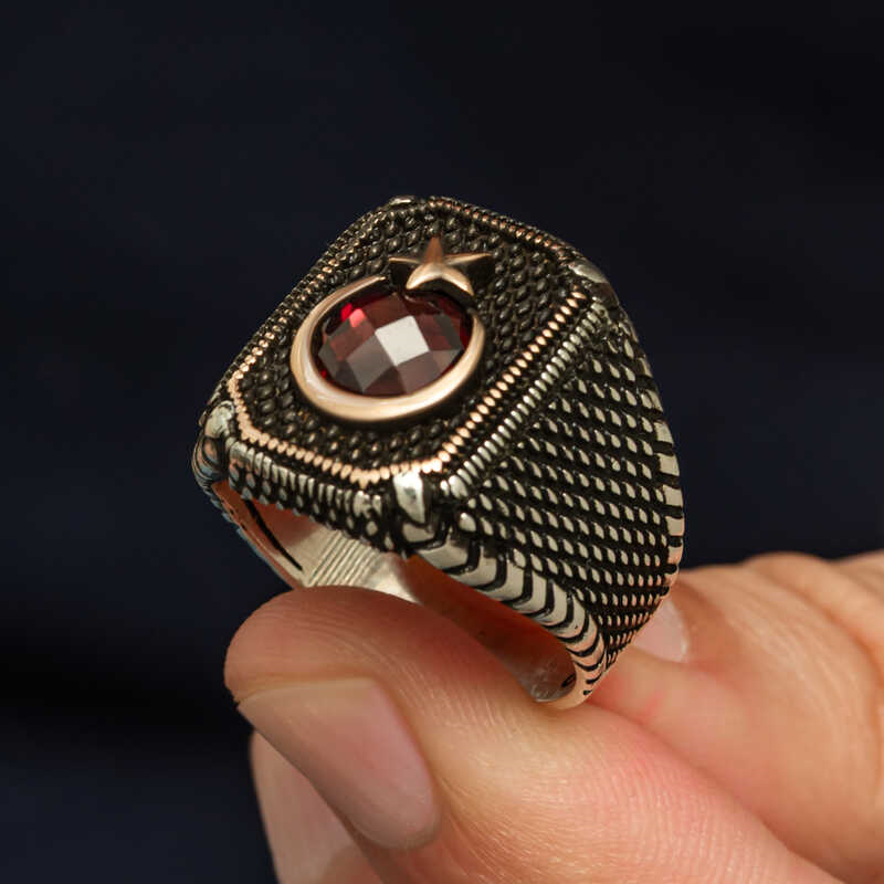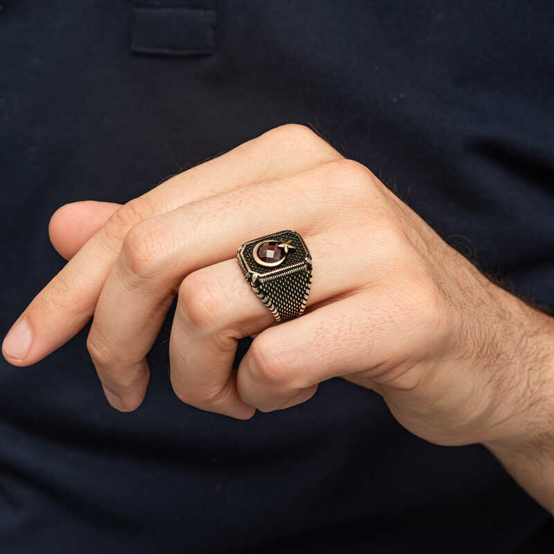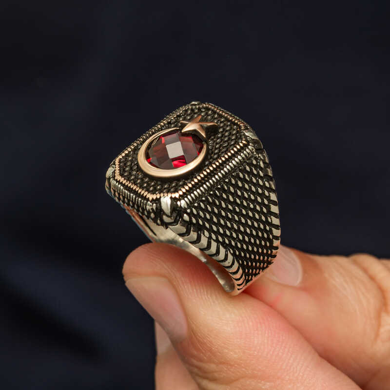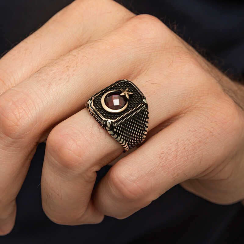 Silver Red Stone Crescent Star Men's Ring This men's ring, which stands out with its elegance and meaningful design, is crafted using high quality silver. This ring, adorned with elegant moon and star motifs, is completed with eye-catching red stone details. This accessory, which embodies care and mastery in every detail, is a perfect choice for men who want to complete their style. You can give it to yourself or your loved ones as a gift on their birthday, Father's Day or special occasions. Oxidized silver is coated. Oxidized silver men's ring models preserve their shine for a long time and oxidation is delayed. Due to silver and precious stones, there may be ± 10% deviation from the average product weight. Ring Width: 1.50 cm. Ring Length: 2.00 cm. Avg. Weight: 15.00 gr.