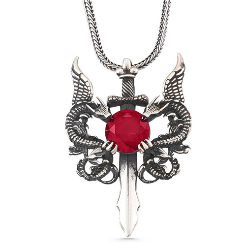Silver Dragon Men's Sword Necklace with Red Stone The dragon sword is a Japanese symbol often associated with Japanese culture and history. The dragon sword has a long and complex history. Its first mention was found in a book called "Kojiki" during the early Edo period (1603-1868). In this story, the god Susanoo finds two swords, one named "Totsuka" and the other "Amakuni." He takes them to his brother Izanagi, who considers them symbols of power. These swords are given to Izanagi's son Amaterasu. The dragon sword was also used as their main weapon by samurai warriors in feudal Japan. They believed they could use these swords to defeat any enemy they faced on the battlefield. The dragon sword is also an important symbol in Chinese culture. It is a symbol of power, strength, and good luck; it is close to the Japanese meaning. The dragon sword has been a part of East Asian cultures for centuries. The dragon sword is said to have been given to the Yellow Emperor by a mysterious old man from the East Sea. The dragon sword was passed down from generation to generation to be used by emperors and heroes in times of need. The dragon sword has been considered an object of art since the Han dynasty. It was often decorated with gold or silver and featured elaborate designs on the blade. The dragon sword was also used in ceremonies, where it would be carried by a high-ranking official or general to symbolize power and prestige. This specially designed silver dragon sword necklace for men with red stones is made of 925 sterling silver. The silver is oxidized. Oxidized silver gives men's necklaces an aged appearance. The necklace's chain length is approximately 55 cm and is made of silver. Like all men's necklaces, the silver sword necklace is handcrafted. Due to silver and precious stones, there may be a ± 10% deviation in the average product weight. Width: 2.90 cm Length: 4.30 cm Avg. Weight: 13.00 gr. Avg. Chain Length: 55.00 cm
