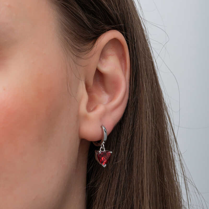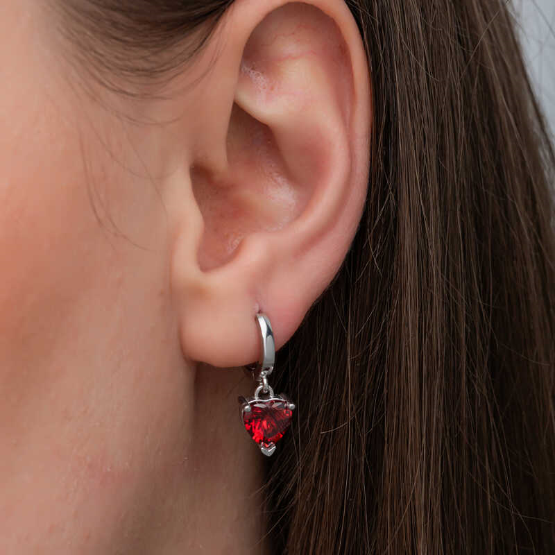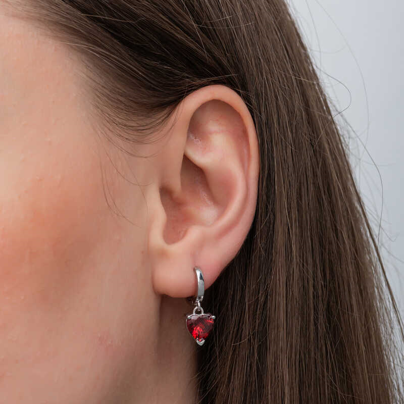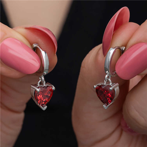 Silver Red Stone Heart EarringsLet your love come to life on the skin of the woman you love with the heart earring model that expresses love with its heart pattern. Adorn your loved one with love with these heart earring models that can be chosen by young lovers and those who feel young on special occasions. Heart patterned earrings that your loved ones will enjoy wearing as much as you will be one of the best gifts for your loved one. Heart women's earrings are made of 925 sterling silver. Rhodium plated on the silver. Rhodium plated silver women's heart earrings preserve their shine for a long time and oxidation is delayed. The stone on the earring is zircon. Like all women's earrings, the silver red stone heart women's earrings are produced by hand. Due to silver and precious stones, there may be a ± 10% deviation in the average product weight.Earring Width: 0.90 cmEarring Length: 2.40 cmAverage Weight: 4.10 gr