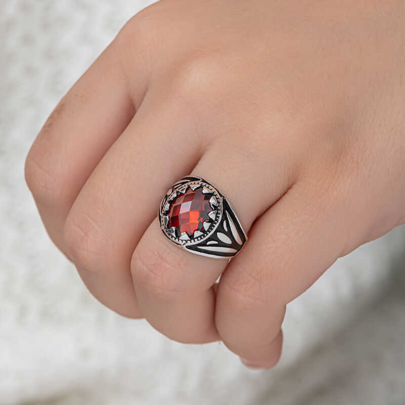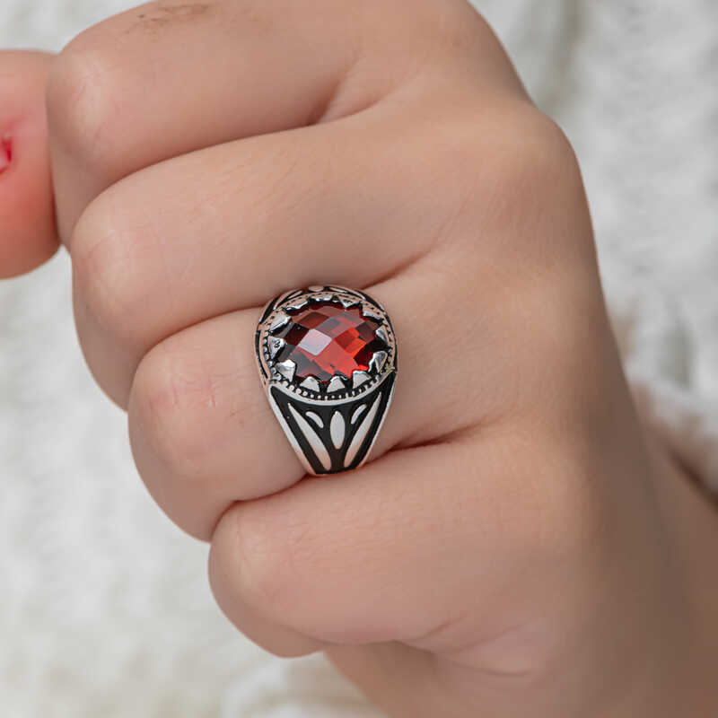 Silver Red Zircon Stone Children's Ring This ring model, made of zircon stones on silver, is a stylish accessory that you can use at any time of the day. You can make your child happy by gifting this ring to them at regular times or on their birthday. Children's boys' ring model with red zircon stones is made of 925 sterling silver. Oxidized silver is coated. Oxidized silver children's rings preserve their shine for a long time. Like all children's boys' rings, the silver red zircon stone men's ring model is also produced by hand. Due to silver and precious stones, there may be ± 10% deviation in the average product weight. Ring Width: 1.60 cm Ring Length: 2.20 cm Average Weight: 4 gr.