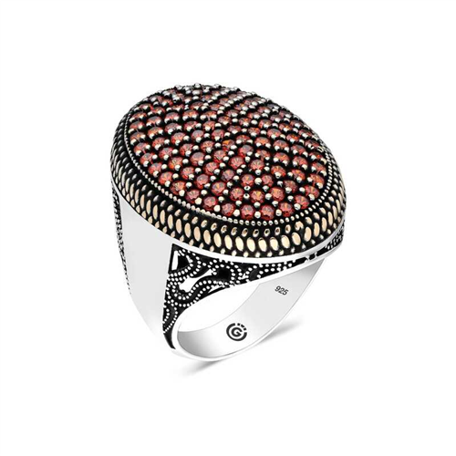 Silver Red Zircon Stone Oval Men's Ring This men's ring model, made of zircon red stone stones on silver, is a stylish accessory that you can use at any time of the day. You can gift this ring to yourself or your loved ones on your birthday, Father's Day or special occasions. The red stone men's ring model is made of 925 sterling silver. Oxide coating is applied on the silver. Oxide coated silver men's ring models preserve their shine for a long time. As with all men's rings, the silver zircon Red stone men's ring model is also handmade. Due to silver and precious stones, there may be ± 10% deviation in the average product weight.Width: 3.20 cmLength: 3.20 cmAvg. Weight: 22 gr.