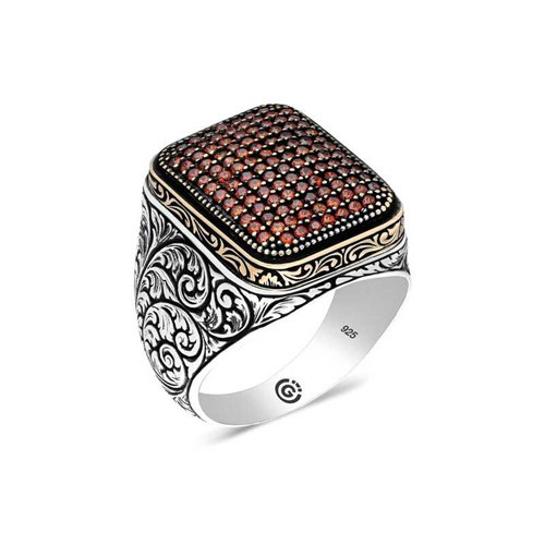 Silver Red Zircon Stone Square Men's Ring This men's ring model, made of zircon red stone stones on silver, is a stylish accessory that you can use at any time of the day. You can gift this ring to yourself or your loved ones on your birthday, Father's Day or special occasions. The red stone men's ring model is made of 925 sterling silver. Oxide coating is applied on the silver. Silver men's rings with oxide coating preserve their shine for a long time. As with all men's rings, the silver zircon Red stone men's ring model is also handmade. Due to silver and precious stones, there may be ± 10% deviation in the average product weight.Width: 2.30 cmLength: 3.10 cmAvg. Weight: 27.20 gr.