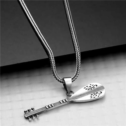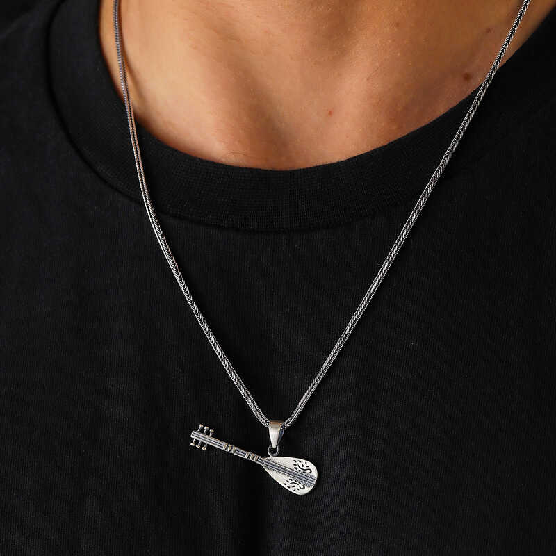 Silver Saz Men's Necklace Bağlama or saz is a type of stringed plectrum instrument widely used in Turkish Folk Music. Instrument-themed necklaces are among the most attractive models for musicians and music lovers. Generally preferred by musicians who carry their music wherever they go, silver necklaces are a nice accessory that reflects a person's style in daily life. This silver saz necklace model, which you and your loved ones will enjoy wearing, will be one of the best gifts. The saz necklace is made of 925 sterling silver. Oxidized silver. Oxidized silver necklace models preserve their shine for a long time and oxidation is delayed. The average length of the silver necklace is 55 cm. Like all necklace models, the silver reed necklace model is also handmade. Due to silver and precious stones, there may be a ± 10% deviation in the average product weight. Width: 4.10 cm Length: 1.00 cm Avg. Weight: 9.50 gr. Avg. Chain Length: 55.00 cm