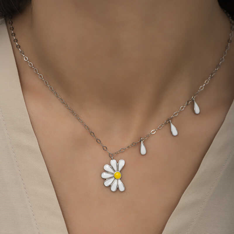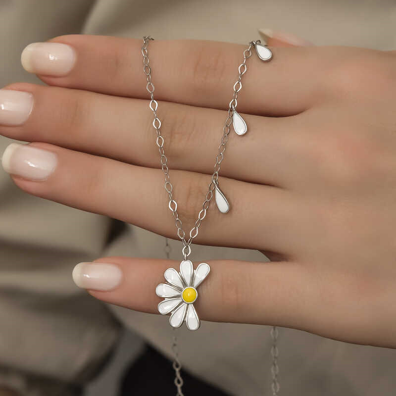 ​Silver Rhodium Daisy Loves Me Not Women's Necklace Daisy flower expresses the meaning of pure love. One of its most important features is that there is one on each stem. This sparkling necklace designed with this beauty is adorned for you ... This stylish necklace is a perfect option for a birthday gift, Valentine's Day gift or a gift for mothers on special occasions. The silver daisy loves me not women's necklace is made of 925 sterling silver. This necklace has rhodium plating. Rhodium-plated silver women's necklace models preserve their shine for a long time. As with all our silver women's necklace models, the silver daisy loves me not women's necklace is produced by hand. Due to silver and precious stones, there may be ± 10% deviation in the average product weight. Width: 1.40 cm Length: 1.80 cm Average Weight: 3.45 gr. Chain Length: 45 cm