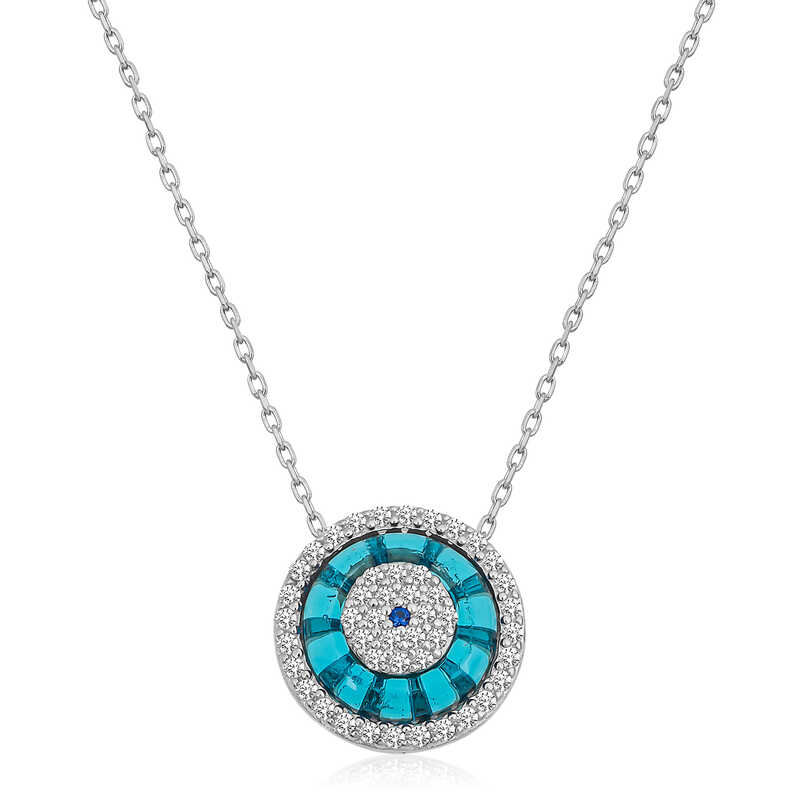 Silver Rhodium Glass-Eye Evil-Eye Women's Necklace We designed the sparkling silver glass-eye women's necklace model that will add elegance to your elegance for you, beautiful women. You will attract attention with this magnificent set. The glass-eye rhodium evil-eye necklace model is made of 925 sterling silver. Rhodium plating is done on silver. Rhodium-plated silver women's necklace models preserve their shine for a long time. Designed by taking advantage of the harmony of zircon stones with glass stones, the product will also allow you to receive all the beneficial effects of the silver mineral directly from your skin. The glass-eye evil-eye necklace is a suitable and beautiful gift option for New Year's, Mother's Day, special days and lovers. Like all silver women's necklace models, the silver glass-eye evil-eye women's necklace model is handmade. There may be a ± 10% deviation in the average product weight due to silver and precious stones. Width: 1.20 cm Length: 1.40 cm Avg. Weight: 3.6 gr. Avg. Chain Length: 45.00 cm