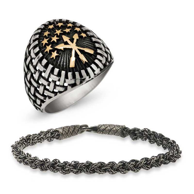 Silver Ring and Kazaz Bracelet Men's Jewelry Combination Men choose from thousands of classic and sporty jewelry options. This Circassian flag-patterned ring and Kazaz knitted bracelet is a lovely combination that reflects your style. It's a perfect choice for a birthday gift, Father's Day, or any special occasion. This stylish set is made of 925 sterling silver. The silver is oxidized. As with all silver men's products, the silver Circassian men's ring and Kazaz knitted bracelet are entirely handmade. Due to silver and precious stones, there may be a ±10% deviation from the stated average product weight.