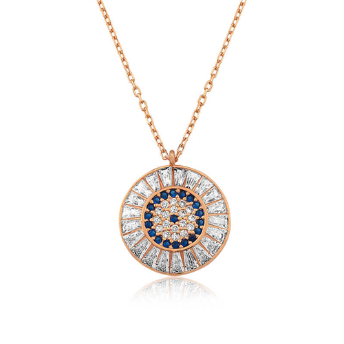 Silver Rose Baguette Stone Evil Eye Necklace People have used the evil eye bead for many years to protect themselves from evil gazes. The evil eye bead is a precaution against the negative effects of evil gazes on people. For this reason, people wear the evil eye bead to protect their loved ones. This evil eye necklace reflects elegance and style. You can choose this model, which has always been popular and does not compromise on its elegance, as a birthday gift, Valentine's Day gift or a gift for mothers on special occasions. The silver evil eye women's necklace is made of 925 sterling silver. Rose gold plated over silver. Rose gold plated silver women's necklaces preserve their shine for a long time and oxidation is delayed. The stones on it are baguette and zircon. Like all silver women's necklace models, this silver baguette stone evil eye women's necklace model is entirely handmade. Due to silver and precious stones, there may be a ± 10% deviation in the average product weight. Width: 1.50 cm Length: 1.50 cm Average Weight: 2.51 gr. Chain Length: 45.00 cm
