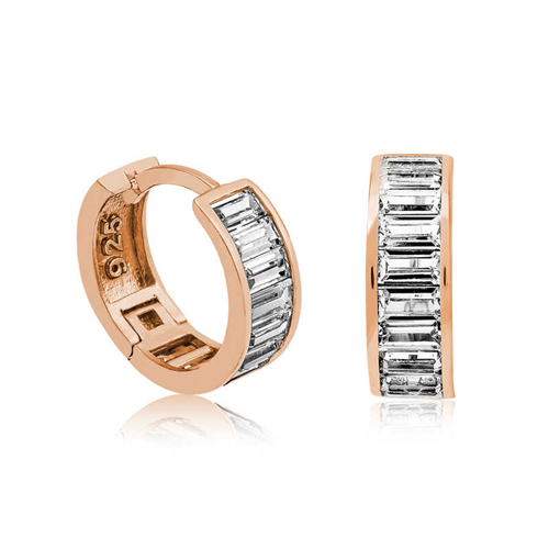 Silver Rose Baguette Stone Hoop EarringsThe rose baguette stone hoop earrings, created with minimal fine lines that can be used in all areas of life, are waiting for you to add sparkle and elegance to your outfits. Different trendy designs are released every year. This year's most popular models stand out as baguette stone products. You can add these stylish earrings to your jewelry box or consider them as a gift for a loved one. The stylish baguette stone hoop earrings are made of 925 sterling silver. Rose plated silver. Rose plated silver earrings preserve their shine for a long time and oxidation is delayed. The stones on them are baguettes. Like all women's silver products, the silver rose baguette stone hoop earrings are produced by hand. Due to silver and precious stones, there may be a ± 10% deviation in the average product weight.Earring Thickness: 0.50 cmEarring Diameter: 1.50 cmAverage Weight: 3.60 gr.