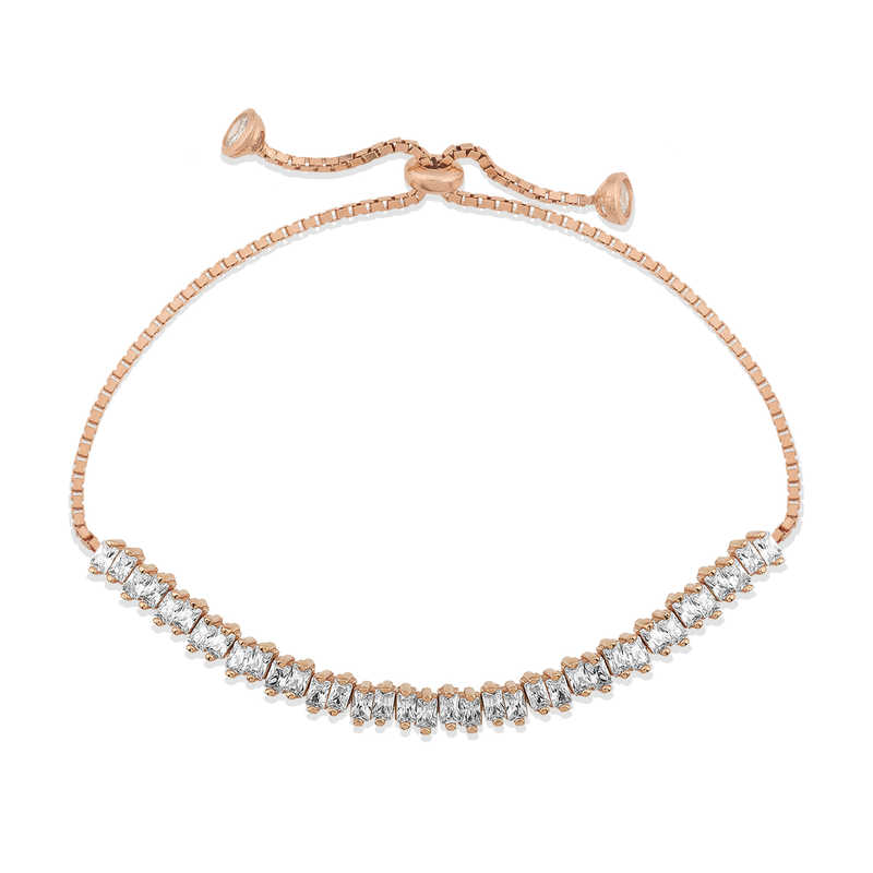 Silver Rose Baguette Stone Waterway Elevator BraceletAn ideal option for women who love a chic and fantasy look. In the collections; for women who pursue showiness and elegance, the white baguette stone elevator bracelet awaits you with a model suitable for every taste and concept. The white baguette stone elevator women's bracelet model is made of 925 sterling silver. Rose plated silver. Rose plated elevator women's bracelet models preserve their shine for a long time. Thanks to its elevator structure, it adapts to every wrist thickness. Like all silver women's bracelet models, the silver baguette stone waterway elevator women's bracelet model is also produced by hand. Due to silver and precious stones, there may be a ± 10% deviation in the average product weight.Width: 0.50 cm Length: 8.00 cm Average Weight: 7.70 gr.