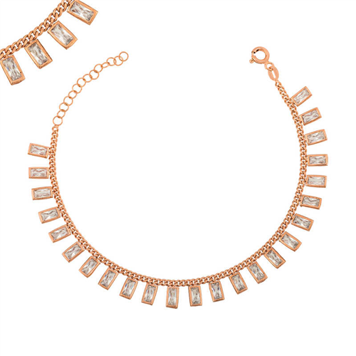Silver Rose Baguette Stone Women's BraceletIt is an ideal option for women who love a chic and fantasy look. In the collections; for women who pursue showiness and elegance, the baguette stone bracelet awaits you with a model suitable for every taste and concept. You can choose this stylish model as a birthday gift or Valentine's Day gift on special occasions. Silver baguette stone women's bracelet is made of 925 sterling silver. Rose gold plated on silver. Rose gold-plated silver women's bracelets preserve their shine for a long time and oxidation is delayed. The stone on it is baguette. As with all silver women's bracelets, this silver baguette stone women's bracelet model is also handmade. Due to silver and precious stones, there may be ± 10% deviation in the average product weight.Width: 0.80 cm. Height: 19.50 cm. Average Weight: 6.02 gr.