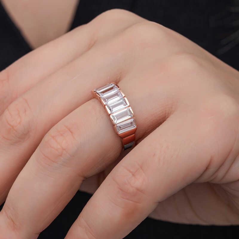 Silver Rose Baget White Stone Women's Ring Decorated with bright baget stones, this stylish ring model is a very fashionable option that you can choose in special days as gifts to birthday gifts, lover's day gifts or mothers. Baget white stone female ring is made of 925 adjustment silver. Rose plated on silver is made. Rose plated silver rings keep brightness for a long time, oxidizing is delayed. The gems on the bagetttir. As with all female silver rings, silver baget white stone female ring model is also manufactured with hand labor. Due to silver and precious stones, the average product weight specified can be ± 10% deviation. Width : 2.00 cm Size : 2.20 cmOrt. Weight : 3.90 gr.