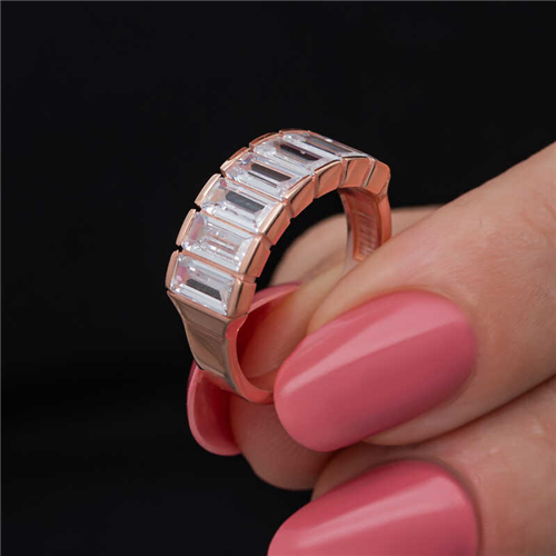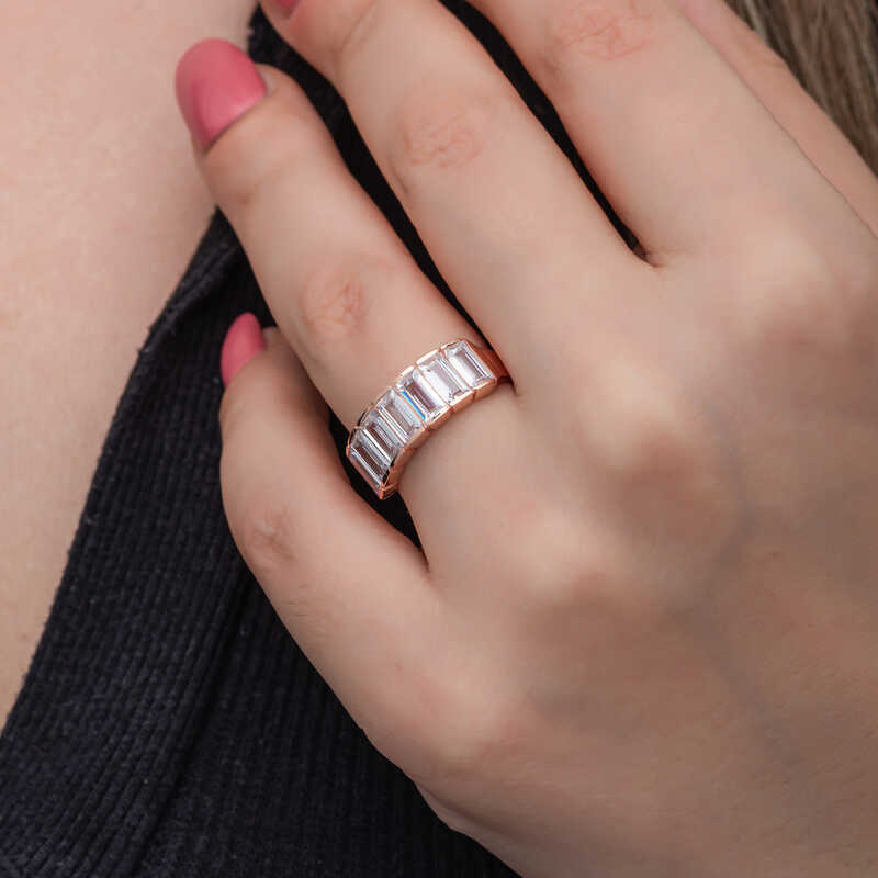 Silver Rose Baguette White Stone Women's RingThis stylish ring model adorned with sparkling baguette stones is a very elegant option that you can choose as a birthday gift, Valentine's Day gift or a gift for mothers on special occasions. Baguette white stone women's ring is made of 925 sterling silver. Rose plated silver. Rose plated silver rings preserve their shine for a long time and oxidation is delayed. The stones on it are baguette. As with all women's silver rings, the silver baguette white stone women's ring model is produced by handmade. Due to silver and precious stones, there may be ± 10% deviation in the average product weight.Width: 2.00 cmLength: 2.20 cmAvg. Weight: 3.90 gr.
