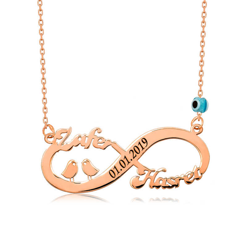 Silver Rose Bird Infinity Name Necklace One of the most beautiful and meaningful ways to express eternal love to your loved one is to gift her infinity-themed silver jewelry. With this special necklace that you will gift to your loved one, you can express your eternal love and give the message that you will be together forever. Infinity bird figured women's necklace model is made of 925 sterling silver. Rose gold plated on silver. Rose gold plated silver women's necklaces preserve their shine for a long time, turn silver to a pink color, and oxidation is delayed. The average length of the silver chain is 45 cm. A personalized name can be written on the necklace. Like all silver women's necklace models, the silver bird infinity necklace model is also produced by hand. Due to silver and precious stones, there may be ± 10% deviation from the average product weight. Note: Please indicate the names you want to be written and the date in the notes section. Width: 1.30 cm Height: 2.80 cm Average Weight: 2.50 gr.