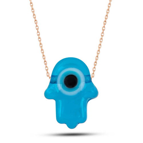 Silver Rose Blue Evil-Eye Glass Hand of Fatima Women's Necklace Although it is known as the Hand of Hz. Fatima, it is called "hamse" in Arabic. Hamse means five and indicates the number of fingers on a hand. One day, while Hz. Fatima was roasting halva in the kitchen, her husband Hz. Ali saw it and dipped his hand into the cooking halva, but nothing happened and he continued roasting the halva like this. From that day on, it was believed that her hand was sacred, strong, and virtually invincible. Every difficulty would be overcome by her hand. Blue evil-eye glass Hand of Fatima women's necklace is made of 925 sterling silver. Rose plating is made on the silver. Rose-plated silver women's necklace models preserve their shine for a long time and oxidation is delayed. The necklace is made of glass stones. The average chain length is 45 cm. As with all silver women's necklace models, the silver blue evil-eye glass Fatima hand women's necklace model is also handmade. Due to silver and precious stones, there may be ± 10% deviation in the specified product weight. Necklace Width: 1.10 cm Necklace Length: 1.40 cm Chain Length: 45 cm Average Weight: 1.70 gr.