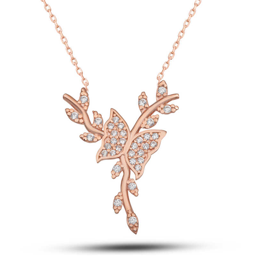 Silver Rose Butterfly on a Branch Women's Necklace Butterfly; is one of the most popular motifs preferred by women. It reminds lovers of the mystery of nature and the richness of human imagination. Butterflies, which symbolize freedom, innocence, and purity, are the expression of pure love and affection. The butterfly on a branch women's necklace, which you and your loved ones will enjoy wearing, will be one of the best gifts for your loved one. The necklace is made of 925 sterling silver. Rose plating is applied to the silver. Rose-plated silver women's necklaces preserve their shine for a long time and delay oxidation. The average silver chain length is 45 cm. Like all silver women's necklaces, the butterfly women's necklace model on a silver branch is also handmade. Due to silver and precious stones, there may be a ± 10% deviation in the average product weight. Width: 1.90 cm Length: 2.50 cm Weight: 2.10 gr.