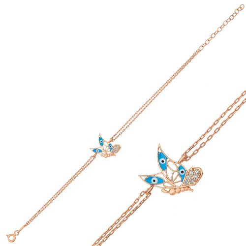 Silver Rose Butterfly Women's Bracelet The butterfly symbol carries the value of the revival of feelings of peace, happiness, youth and romance, as well as a clean and pure love. Butterfly models, which offer an extremely elegant look and are often used by women in necklaces and bracelets, have a popular place in the world of Greek and Far Eastern jewelry, representing the maturation of the body. Psychologically, butterfly models are described as the transformation and renewal of the soul. This stylish bracelet is a perfect choice for a birthday gift, Valentine's Day, or special occasions. The bracelet is made of 925 sterling silver. Rose plating is applied to the silver. Rose-plated women's bracelets preserve their shine for a long time and delay oxidation. Like all silver bracelets, this silver butterfly bracelet is handcrafted. The stones on it are zircon. Due to silver and precious stones, there may be ± 10% deviation in the specified product weight. Butterfly Width: 1.30 cm Butterfly Length: 1.50 cm Bracelet Length: 18.00 cm Average Weight: 1.60 gr.
