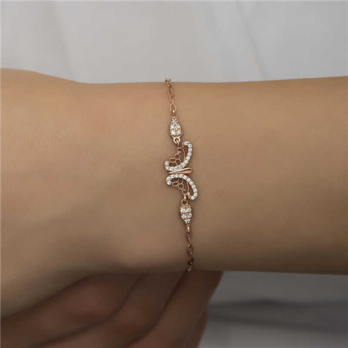 Silver Rose Butterfly Women's Bracelet The butterfly symbol carries the value of the revival of feelings of peace, happiness, youth and romance, as well as a clean and pure love. Butterfly models, which offer an extremely elegant look and are often used by women in necklaces and bracelets, have a popular place in the world of Greek and Far Eastern jewelry, representing the maturation of the body. Psychologically, butterfly models are described as the transformation and renewal of the soul. This stylish bracelet is a perfect choice for a birthday gift, Valentine's Day, or special occasions. The bracelet is made of 925 sterling silver. Rose plating is applied to the silver. Rose-plated women's bracelets preserve their shine for a long time and delay oxidation. Like all silver bracelets, this silver butterfly bracelet is handcrafted. The stones on it are zircon. Due to silver and precious stones, there may be ± 10% deviation in the specified product weight. Butterfly Width: 1.70 cm Butterfly Length: 0.90 cm Bracelet Length: 21.00 cm Average Weight: 1.70 gr.