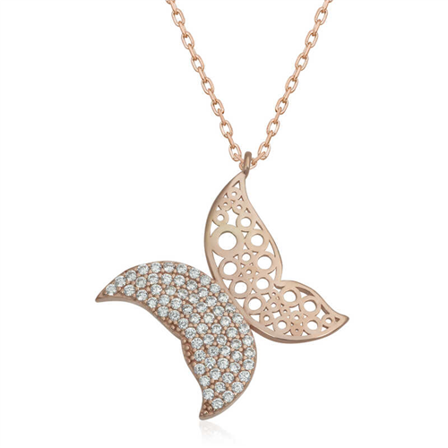 Silver Rose Butterfly Women's Necklace Butterfly is one of the most popular motifs preferred by women. It reminds lovers of the mystery of nature and the richness of human imagination. Symbolizing freedom, innocence, and purity, butterflies are an expression of pure love and affection. A butterfly women's necklace, which you and your loved ones will enjoy wearing, will be one of the best gifts for your loved one. The necklace is made of 925 sterling silver. Rose plating is applied to the silver. Rose-plated silver women's necklaces preserve their shine for a long time and delay oxidation. The average silver chain length is 45 cm. Like all silver women's necklaces, the silver butterfly women's necklace model is also handmade. Due to silver and precious stones, there may be a ± 10% deviation in the average product weight. Width: 2.00 cm Length: 1.90 cm Weight: 2.60 gr.