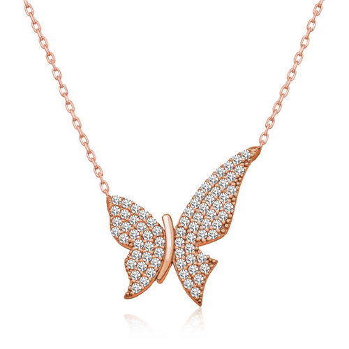 Silver Rose Butterfly Women's Necklace One of the strongest meanings of the butterfly is that it symbolizes change. In ancient Greece, it symbolized the influence of the soul on the body and the profound changes created by this influence. In ancient wisdom, the butterfly is a direct symbol of the soul, symbolizing its freedom, lightness, and elegance. It is one of the most popular motifs preferred by women. It reminds loved ones of the mystery of nature and the richness of human imagination. This butterfly necklace model, which you can also choose as a tasteful gift to bring happiness to your loved ones on special occasions, is made of 925 sterling silver. The silver is rose-plated. Rose-plated silver butterfly necklaces maintain their shine for a long time. The white stones on it are zircon. You will be able to carry your loved ones in your heart and their names around your neck with the necklace you will carry as a manifestation of your love. All of our products are handmade. Due to silver and precious stones, there may be a ± 10% deviation in the average product weight. Width: 2.10 cm Length: 2.00 cm Average Weight: 3.30 gr. Chain Length: 45 cm