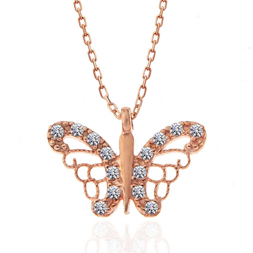 Silver Rose Butterfly Women's Necklace Butterfly is one of the most popular motifs preferred by women. It reminds lovers of the mystery of nature and the richness of human imagination. Symbolizing freedom, innocence, and purity, butterflies are an expression of pure love and affection. A butterfly women's necklace, which you and your loved ones will enjoy wearing, will be one of the best gifts for your loved one. The necklace is made of 925 sterling silver. Rose plating is applied to the silver. Rose-plated silver women's necklaces preserve their shine for a long time and delay oxidation. The average silver chain length is 45 cm. Like all silver women's necklaces, the silver butterfly women's necklace model is also handmade. Due to silver and precious stones, there may be a ± 10% deviation in the average product weight. Width: 1.60 cm Length: 1.10 cm Average Weight: 1.40 gr.
