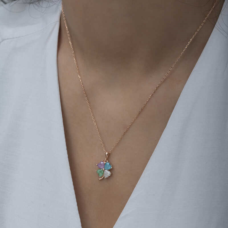 Silver Rose-Colored Stone Heart Clover Women's Necklace Clover has dozens of benefits besides bringing luck. A person who wears a clover necklace will also carry luck and healing with them. The heart clover with colored stones is considered a symbol of good luck in all cultures. The first leaf symbolizes hope, the second symbolizes faith, the third symbolizes love, and the fourth leaf symbolizes luck. The heart clover women's necklace adorned with silver-colored zircon stones is a wonderful model that you can enjoy using and gifting to your loved ones. The silver-colored stone women's necklace is made of 925 sterling silver. Rose plating is used on the silver necklace. Rose-plated silver women's necklaces preserve their shine for a long time and oxidation is delayed. The average silver chain length is 45 cm. As with all our silver women's necklace models, the silver-colored stone heart clover women's necklace is also handmade. Due to silver and precious stones, there may be ± 10% deviation in product weight. Width: 1.20 cm. Length: 2.00 cm. Weight: 2.50 gr.