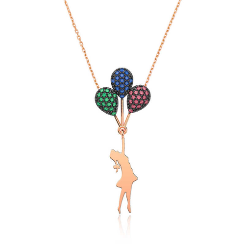 Silver Rose Colored Balloon Girl Necklace We designed this lively girl who holds colorful balloons and colorful dreams that reflect our dreams for you. This wonderful necklace is a perfect option for a birthday gift, Valentine's Day gift or Mother's Day gift on special occasions. This stylish design is made of 925 sterling silver. This necklace is rose plated. Rose plated necklaces preserve their shine for a long time and turn the silver color into pink. Like all silver women's necklaces, the silver colored balloon girl necklace is produced by hand. Due to silver and precious stones, there may be a ± 10% deviation in the specified product weight. Width: 2.00 cm Length: 3.20 cm Average Weight: 2.11 gr.