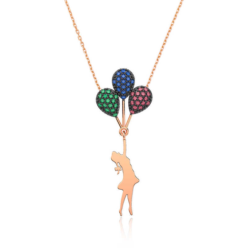 Silver Rose Colored Balloon Girl Necklace We designed this lively girl who holds colorful balloons and colorful dreams that reflect our dreams for you. This wonderful necklace is a perfect option for a birthday gift, Valentine's Day gift or Mother's Day gift on special occasions. This stylish design is made of 925 sterling silver. This necklace is rose plated. Rose plated necklaces preserve their shine for a long time and turn the silver color into pink. Like all silver women's necklaces, the silver colored balloon girl necklace is produced by hand. Due to silver and precious stones, there may be a ± 10% deviation in the specified product weight. Width: 2.00 cm Length: 3.20 cm Average Weight: 2.11 gr.