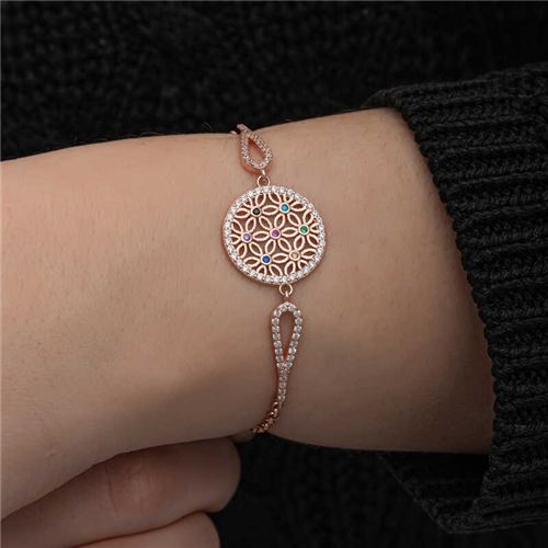 Silver Rose Colored Flower of Life Women's Bracelet The flower of life describes the creation of humans and all living things in a geometric way. Its symbols refer to the existence of a single creator. Indeed, the order of creation of humans and all living things is hidden in the geometric shapes of the flower of life. The focal point of the flower of life, also known as the "language of silence" and the "language of light" in the world, is its pure form and proportions. The flower of life consists of 20 interlocking circles, and these circles hold the secret of the entire universe. The first 7 circles within the flower of life symbolize that the world was formed in 7 days. The flower of life is associated with sacred geometric shapes, and the flower of life has been used in almost all Abrahamic religions. Accessories bearing the flower of life symbol help people achieve a more energetic mood and cleanse the soul. You can choose this ever-popular model as a birthday gift, Valentine's Day gift, or a gift for mothers on special occasions. Silver flower of life bracelet is made of 925 sterling silver. Rose plated silver. Rose plated silver women's bracelets preserve their shine for a long time and oxidation is delayed. The stones on it are zircon. As with all silver women's bracelets, this silver women's bracelet model is entirely handmade. Due to silver and precious stones, there may be a ± 10% deviation from the average product weight. Flower of Life Diameter: 1.80 cm Chain length: 20 cm Average Weight: 4.50 gr.