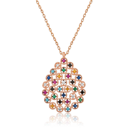 Silver Rose Colored Stone Drop Necklace You will love using this necklace, which reminds me of stars with its colorful sparkling stones, that you can choose in everyday life, special occasions and nights. This timeless silver drop necklace with colored stones is waiting for all women who want to create a stylish look. Silver colored stone drop women's necklace is a perfect option for a birthday gift, Valentine's Day gift or as a gift for mothers on special occasions. Colored stone drop women's necklace is made of 925 sterling silver. Rose plated silver. Rose plated women's necklaces preserve their shine for a long time, turn the silver into a pink color and delay oxidation. The stones on it are zircon. The chain length is approximately 50 cm. Like all women's necklaces, silver colored stone drop women's necklace is produced by hand. Due to silver and precious stones, there may be a ± 10% deviation in the average product weight. Width: 1.90 cm Length: 2.20 cm Average Weight: 5.25 gr. Chain Length: 50 cm