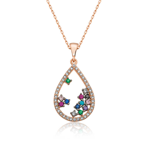Silver Rose Colored Stone Drop Necklace You will love using this necklace, which reminds me of stars with its sparkling stones, that you can choose in everyday life, special occasions and nights. This timeless silver drop necklace with colored stones is waiting for all women who want to create a stylish look. Silver colored stone drop women's necklace is a perfect option for a birthday gift, Valentine's Day gift or as a gift for mothers on special occasions. Colored stone drop women's necklace is made of 925 sterling silver. Rose gold plated on silver. Rose gold plated women's necklaces preserve their shine for a long time, turn the silver into a pink color and delay oxidation. The stones on it are zircon. The chain length is approximately 45 cm. Like all women's necklaces, silver colored stone drop women's necklace is produced by hand. Due to silver and precious stones, there may be a ± 10% deviation in the average product weight. Width: 1.90 cm Length: 2.20 cm Average Weight: 3.65 gr.