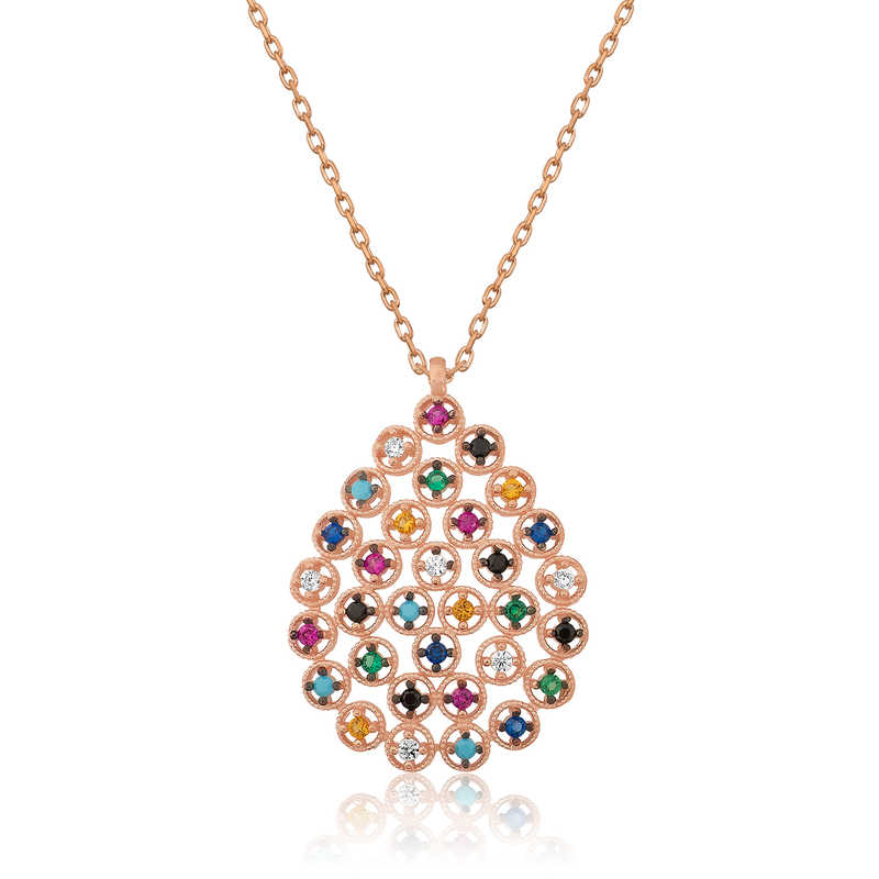 Silver Rose Colored Stone Drop Necklace You will love using this necklace, which reminds me of stars with its colorful sparkling stones, that you can choose in everyday life, special occasions and nights. This timeless silver drop necklace with colored stones is waiting for all women who want to create a stylish look. Silver colored stone drop women's necklace is a perfect option for a birthday gift, Valentine's Day gift or as a gift for mothers on special occasions. Colored stone drop women's necklace is made of 925 sterling silver. Rose plated silver. Rose plated women's necklaces preserve their shine for a long time, turn the silver into a pink color and delay oxidation. The stones on it are zircon. The chain length is approximately 50 cm. Like all women's necklaces, silver colored stone drop women's necklace is produced by hand. Due to silver and precious stones, there may be a ± 10% deviation in the average product weight. Width: 1.90 cm Length: 2.20 cm Average Weight: 5.25 gr. Chain Length: 50 cm