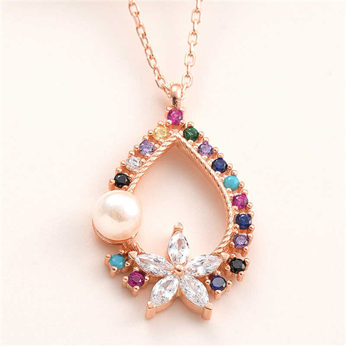 Silver Rose-Colored Stoned Flower Women's Necklace The most special and elegant way to express your feelings to your loved ones is with stylish, colorful and fragrant flowers that you can send her. Flowers, which are among the gifts to be given on special occasions, have been designed with a different interpretation this time ... This stylish silver-colored stoned flower necklace is a perfect option for a birthday gift, Valentine's Day gift or as a gift for mothers on special occasions. Silver-colored stoned flower women's necklace is made of 925 sterling silver. This necklace is rose plated. Rose-plated silver women's necklace models preserve their shine for a long time. The stones on it are zircon. As with all our silver women's necklace models, the silver-colored stoned flower women's necklace model is also handmade. Due to silver and precious stones, there may be ± 10% deviation in the average product weight. Width: 1.40 cm Length: 2.40 cm Avg. Weight: 2.90 gr. Chain Length: 45 cm