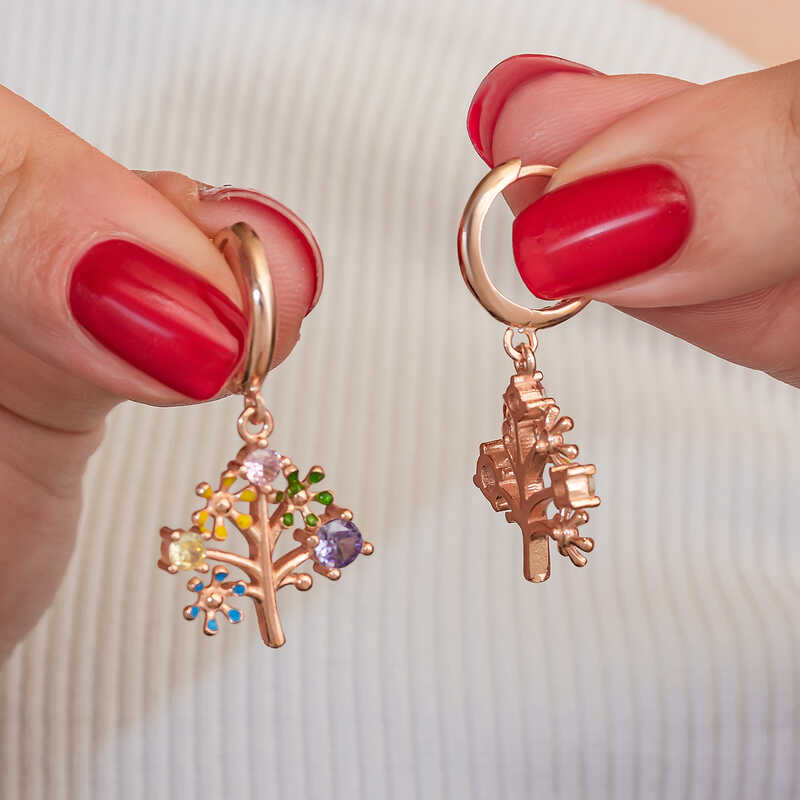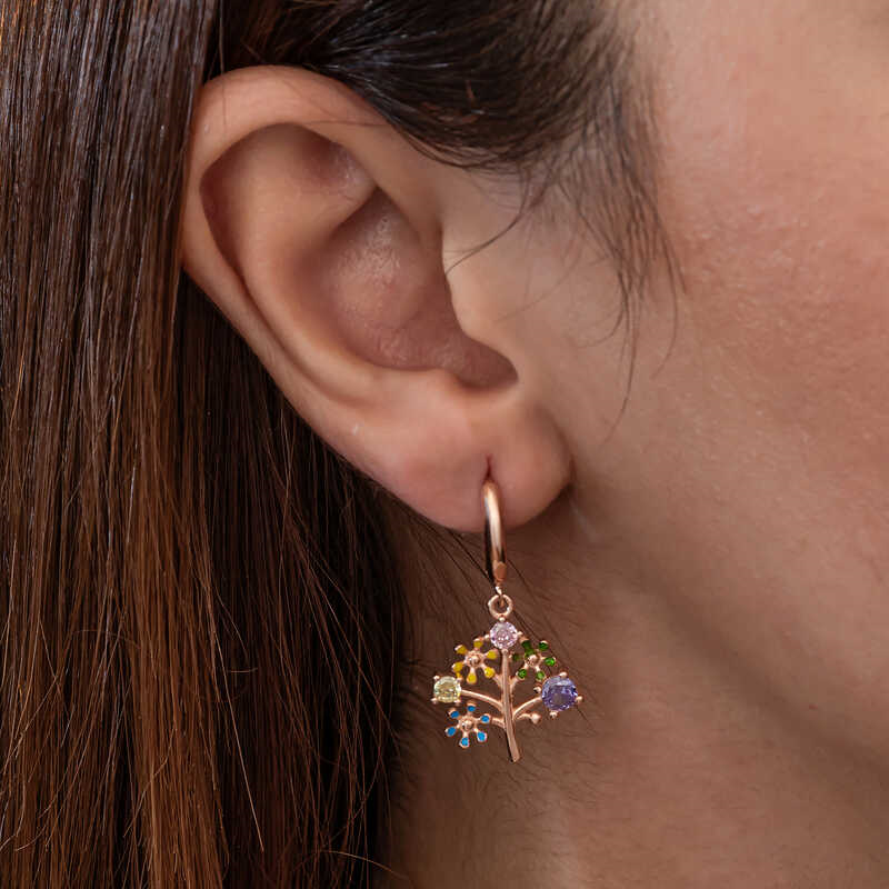 Silver Tree of Life Earrings with Rose Colored Stones for Women The tree of life is an important symbol in many cultures and belief systems. It generally represents the cycle of life, growth, commitment and family ties. It can also be a meaningful option as a gift, as the tree of life symbolizes the bonds of friendship and love. This stylish design is made of 925 sterling silver. This earring is rose plated. Rose plated silver preserves its shine for a long time and oxidation is delayed. The stones on it are zircon. Like all silver women's earrings, the silver tree of life earrings are hand-crafted. Due to silver and precious stones, there may be a ± 10% deviation in the average product weight. Earring Width: 1.60 cm Earring Length: 3.00 cm Average Weight: 5.70 gr.