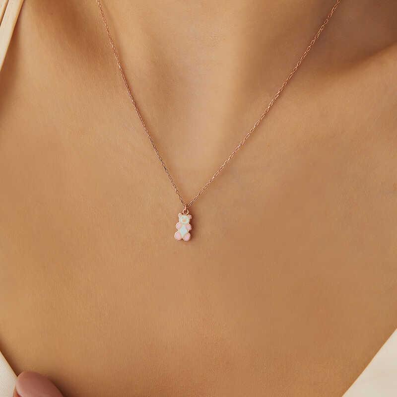 Silver Rose Colored Teddy Bear Women's Necklace We designed our sweetest, warm, lovely animals for you. This stylish necklace with its sparkling and different design is made of 925 sterling silver. Rose plated silver. Rose plated silver women's necklaces preserve their shine for a long time and oxidation is delayed. As with all silver necklaces, the silver colored teddy bear necklace is entirely handmade. Due to silver and precious stones, there may be ± 10% deviation from the average product weight. Width: 0.60 cm Length: 1.10 cm Average Weight: 1.80 gr.