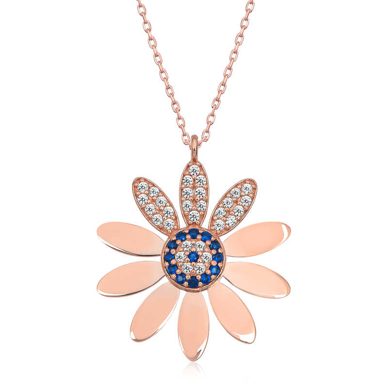 Silver Rose Evil Eye Daisy Women's Necklace Daisy flower expresses the meaning of pure love. One of its most important features is that there is one on each stem. This sparkling necklace designed with this beauty is adorned with zircon stones ... This stylish necklace is a perfect option for a birthday gift, Valentine's Day gift or a gift for mothers on special occasions. Silver evil eye daisy women's necklace is made of 925 sterling silver. This necklace has rose plating. Rose plated products preserve their shine for a long time. The sparkling stones on it are zircon. Like all silver women's necklace models, the silver evil eye daisy women's necklace model is also produced by hand. Due to silver and precious stones, there may be a ± 10% deviation in the average product weight. Width: 2.00 cm Length: 2.30 cm Average Weight: 2.30 gr.