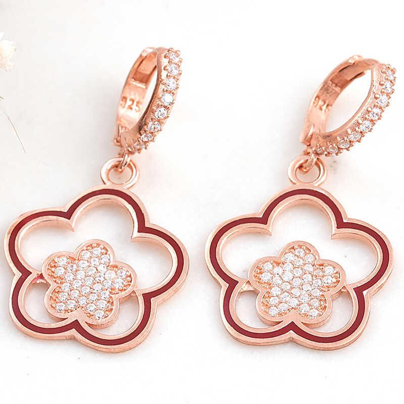 Silver Rose Dangle Floral Patterned Women's EarringsEarrings, which are among the top choices of women on special occasions, are the savior of many women. Floral patterned earrings that you can combine with any outfit, from sporty to classic, are here at a very affordable price. You can complete your elegance with this model supported by small white zircon stones embroidered on an elegant flower motif. This earring model is made of 925 sterling silver. Rose plated silver. Rose plated silver earring models preserve their shine for a long time and oxidation is delayed. As with all silver earrings, the silver flower patterned women's earring model is produced entirely by hand. There may be ± 10% deviation in the average product weight due to silver and precious stones.Width: 2.00 cm. Length: 2.30 cm. Average Weight: 5 gr.