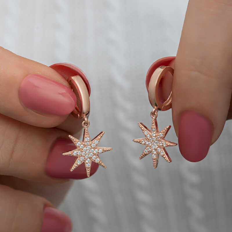 Silver Rose Dangle Pole Star Women's EarringsOur collection includes different earring models that can adapt to the style of women of all ages, and uniquely designed earring models are waiting for you. The earring designed using the pole star figure will blow your mind. A model suitable for daily use, the earring is with you at all times. You will love using the dazzling silver pole star earrings. You will definitely find the right earring for both yourself and your loved ones in this collection. Silver pole star earrings are made of 925 sterling silver. Rose plated silver. Rose plated silver women's earrings preserve their shine for a long time and oxidation is delayed. The stones on them are zircon. Like all silver women's earrings, these silver dangling pole star earring model is also hand-crafted. Due to silver and precious stones, there may be a ± 10% deviation in the average product weight.Width: 1.50 cmLength: 2.90 cmAverage Weight: 3.30 gr.