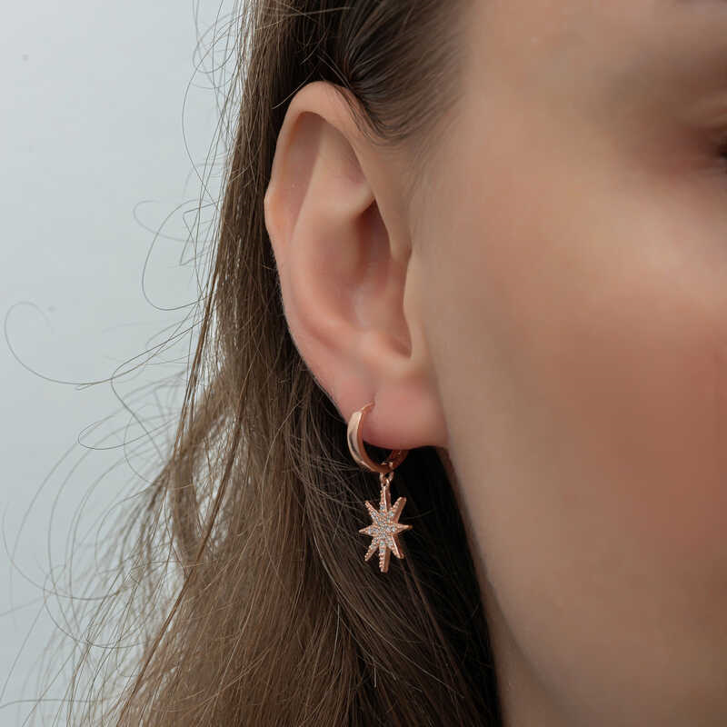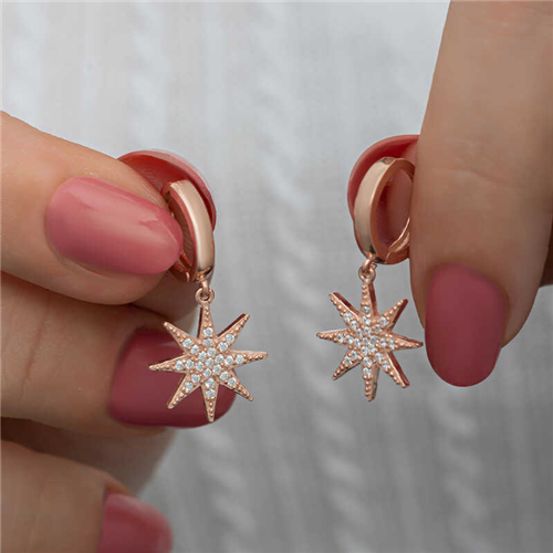 Silver Rose Dangle Pole Star Women's EarringsOur collection includes different earring models that can adapt to the style of women of all ages, and uniquely designed earring models are waiting for you. The earring designed using the pole star figure will blow your mind. A model suitable for daily use, the earring is with you at all times. You will love using the dazzling silver pole star earrings. You will definitely find the right earring for both yourself and your loved ones in this collection. Silver pole star earrings are made of 925 sterling silver. Rose plated silver. Rose plated silver women's earrings preserve their shine for a long time and oxidation is delayed. The stones on them are zircon. Like all silver women's earrings, these silver dangling pole star earring model is also hand-crafted. Due to silver and precious stones, there may be a ± 10% deviation in the average product weight.Width: 1.50 cmLength: 2.90 cmAverage Weight: 3.30 gr.