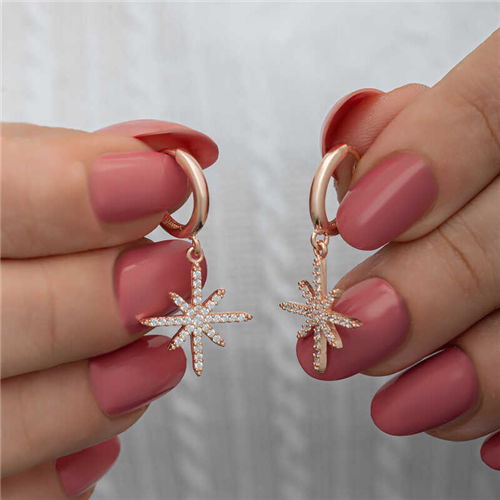 Silver Rose Dangle Pole Star Women's EarringsOur collection includes different earring models that can adapt to the style of women of all ages, and uniquely designed earring models are waiting for you. The earring designed using the pole star figure will blow your mind. A model suitable for daily use, the earring is with you at all times. You will love using the dazzling silver pole star earrings. You will definitely find the right earring for both yourself and your loved ones in this collection. Silver pole star earrings are made of 925 sterling silver. Rose plated silver. Rose plated silver women's earrings preserve their shine for a long time and oxidation is delayed. The stones on them are zircon. Like all silver women's earrings, these silver dangling pole star earring model is also hand-crafted. Due to silver and precious stones, there may be a ± 10% deviation in the average product weight.Width: 1.50 cmLength: 2.90 cmAverage Weight: 3.50 gr.