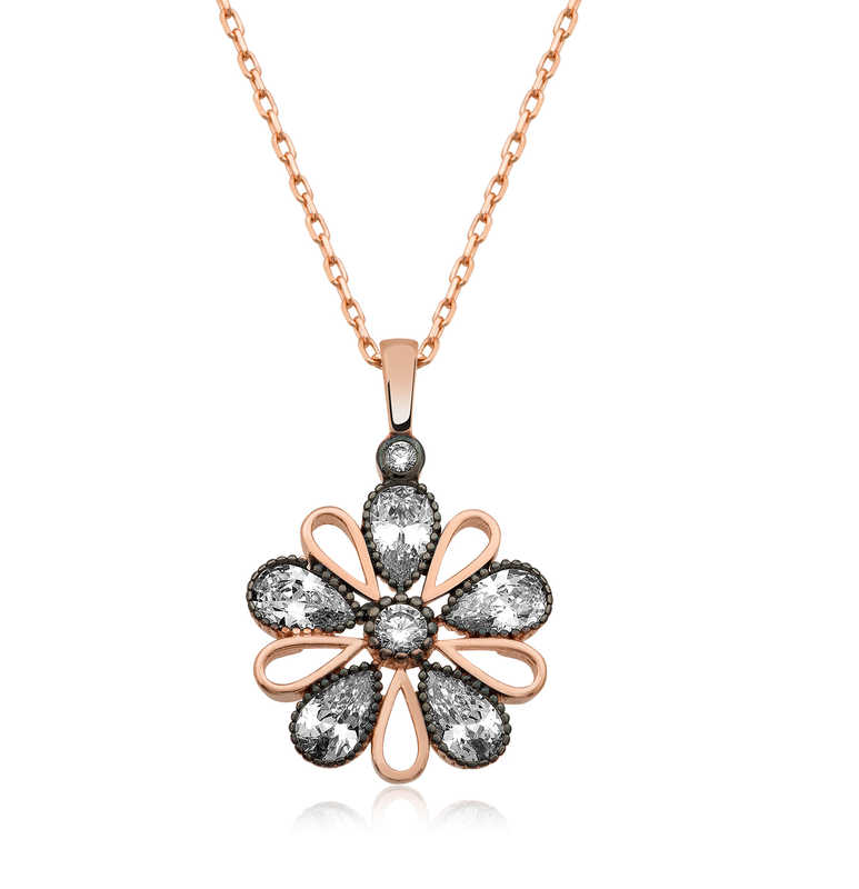 Silver Rose Diamond Mounted Flower Women's Necklace Silver diamond mounting design necklaces, reflecting sparkle and ostentation, aim to add elegance to your style. Modernly designed silver diamond mounting flower patterned necklaces will highlight your feminine elegance. These necklaces integrate with your beauty both in daily use and at special occasions, revealing eye-catching elegance. Diamond elegance continues to cherish love, passion and vitality at all ages and in all places. Beautiful silver necklaces that evoke admiration with their showiness or highlight feminine refinement with their simply elegant design are waiting for you. Rose plating is made on silver. Rose gold-plated silver women's necklace models preserve their shine for a long time and oxidation is delayed. The stones on the silver necklace model are zircon. The average length of the silver chain is 45 cm. This diamond-mounted flower women's necklace model is handmade. Due to silver and precious stones, there may be a ± 10% deviation in the specified product weight. Width: 1.50 cm Length: 2.00 cm Average Weight: 2.00 gr.