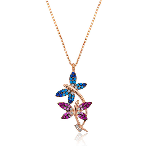 Silver Rose Double Butterfly Women's Necklace A transformation from caterpillar to butterfly. It is a creature that has won people's admiration with its colorful wings. The butterfly symbol carries the value of peace, happiness, the revival of youth and romance, as well as a clean and pure love. Butterfly models, which offer an extremely elegant look and are often used by women in necklaces and bracelets, have a popular place in the world of Greek and Far Eastern jewelry, representing the maturation of the body. Psychologically, butterfly models are described as the transformation and renewal of the soul. This stylish necklace is a perfect choice for a birthday gift, Valentine's Day, or special occasions. The necklace is made of 925 sterling silver. Rose gold-plated over the silver. Rose gold-plated women's necklaces preserve their shine for a long time, turn the silver color pink, and delay oxidation. The stones on them are zircon. Like all silver bracelets, the silver butterfly necklace is handcrafted. Due to silver and precious stones, there may be a ± 10% deviation in the specified product weight. Width: 1.50 cm Length: 2.50 cm Average Weight: 2.26 gr. Chain Length: 45 cm